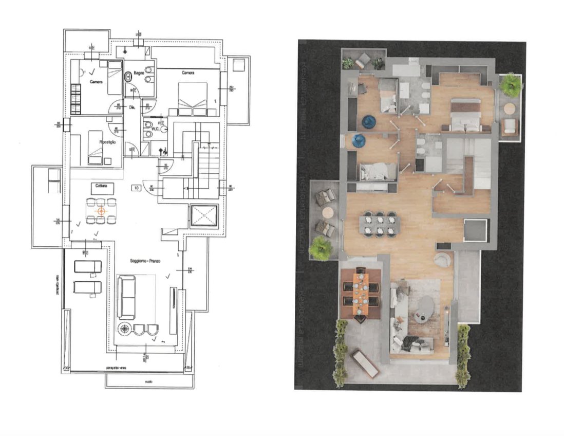 Appartamento in oggetto: Attico sito al 3° piano più quarto di mq. 140 c.ca con ampio terrazzo di mq. 144 c.ca Composto da soggiorno con angolo cottura, 3 camere da letto due bagni. Ampi terrazzi logge, balconi e lastrico solare.